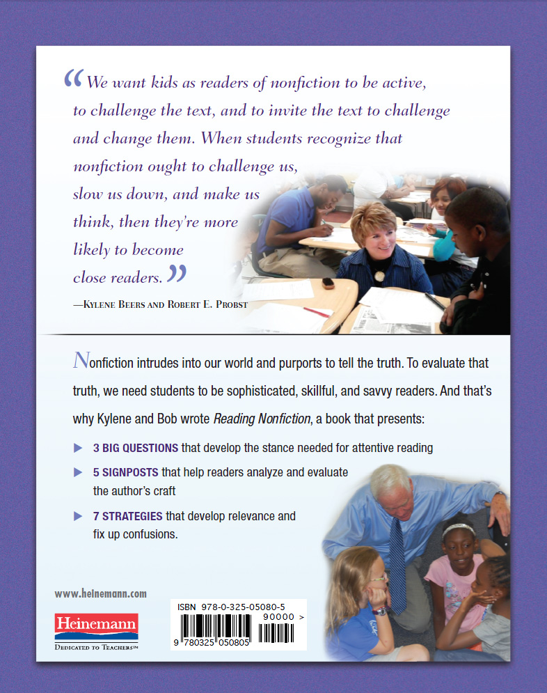 Picking up where their smash hit Notice & Note left off, Kylene Beers and Bob Probst write: “Fiction invites us into the writer’s imagined world; nonfiction intrudes into ours and purports to tell us something about it.” This crucial difference increases the responsibility of the nonfiction reader, so Kylene and Bob have developed interlocking scaffolds that every student can use to go beyond a superficial reading: