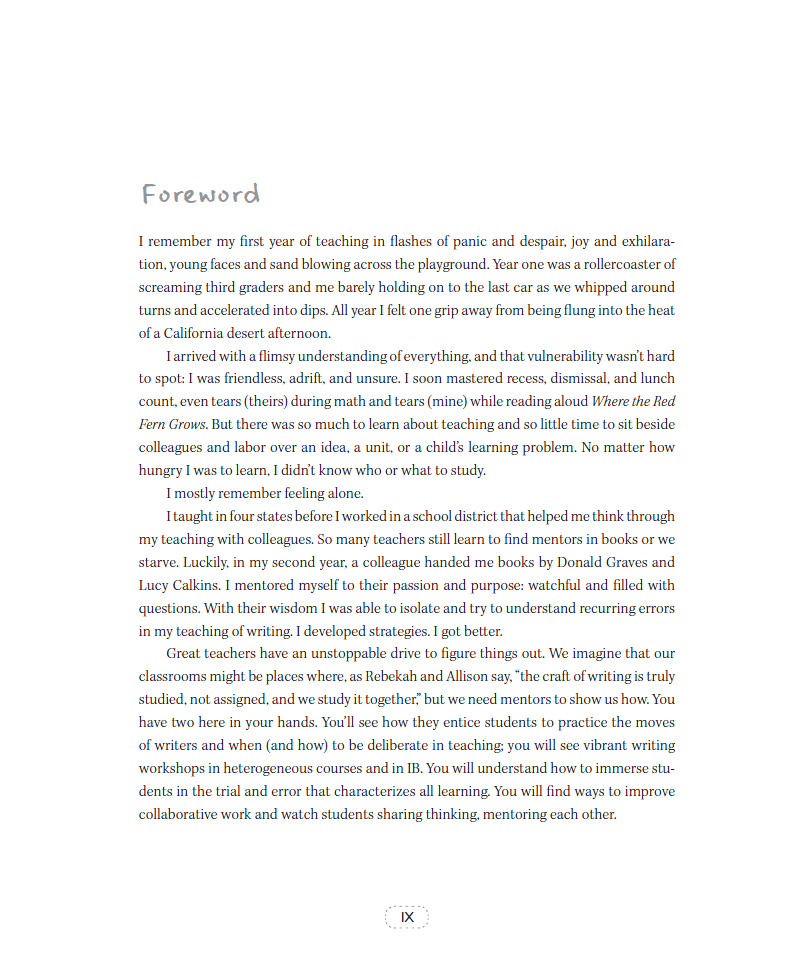 "Great teachers have an unstoppable drive to figure things out. We imagine that our classrooms might be places where, as Rebekah and Allison say, "the craft of writing is truly studied, not assigned, and we study it together," but we need mentors to show us how. You have two here in your hands. I am certain Don [Graves] would have celebrated these wise, kind, and fearless advocates for young writers. This book vibrates with joy and possibility."--Penny Kittle, from the Foreword