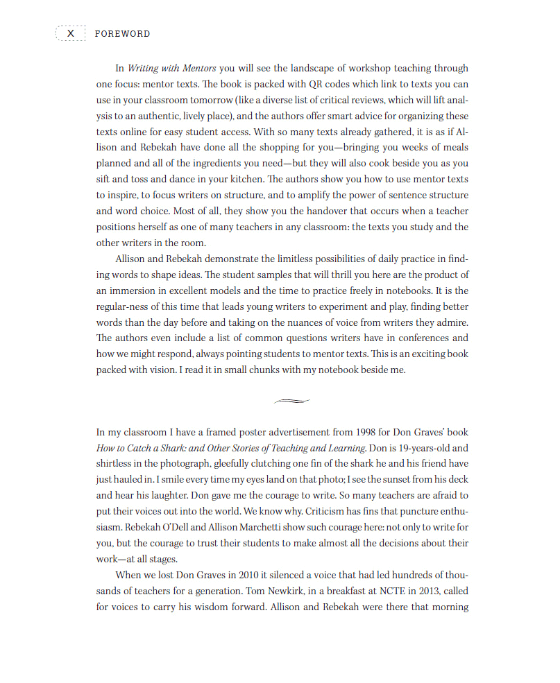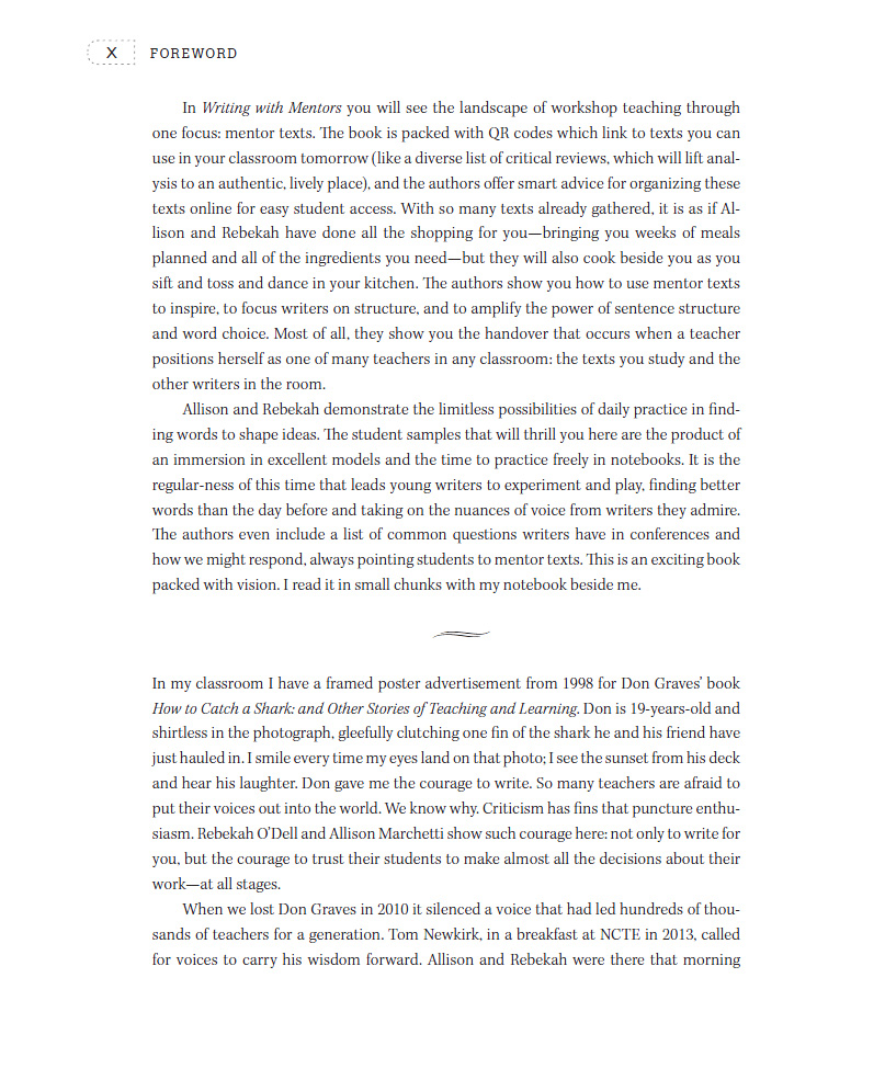 With a pen in one hand to take notes and my Smart phone in the other to scan the QR codes of the numerous mentor texts, I finished the book with an incredible amount of ideas to implement in my classroom and a list of mentor texts to use with my high school students. Writing with Mentors is a long-awaited book that illuminates the power of using mentor texts and gives teachers the tools to move their students to places in their writing beyond where they ever thought they could go.