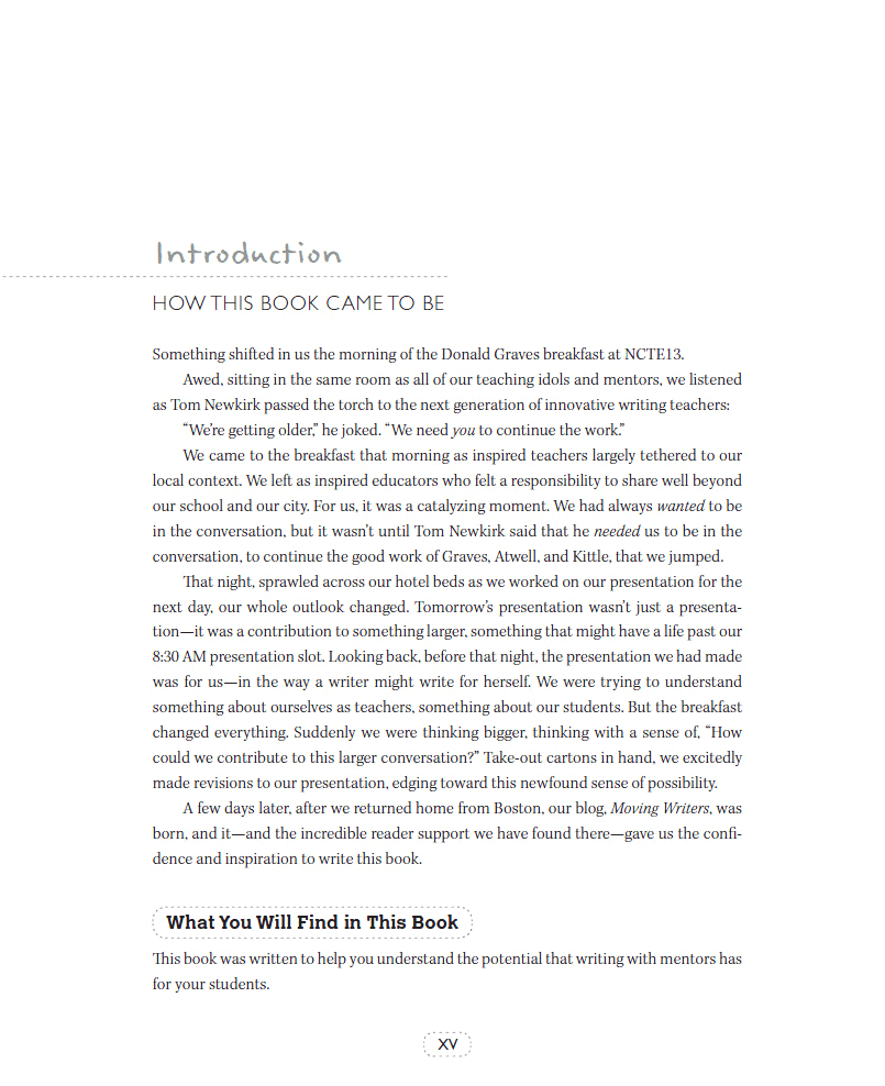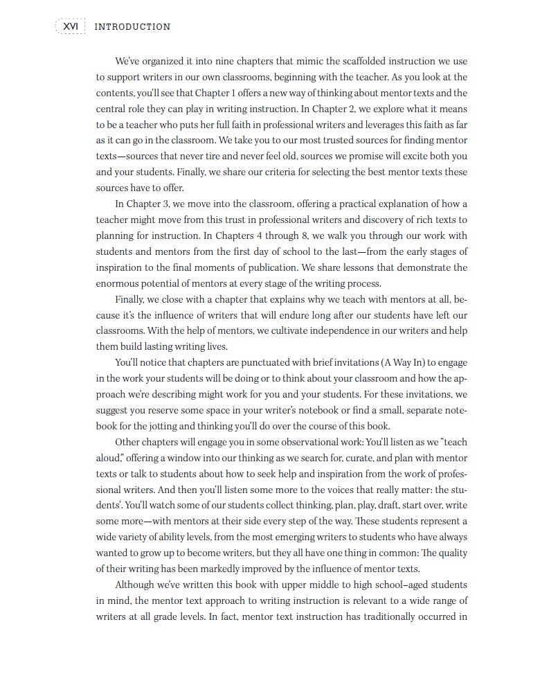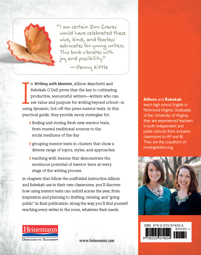 Wow! Writing with Mentors has transformed the way I think about using exemplar pieces. Instead of a writing instruction add-on, Allison and Rebekah show how mentor texts can—no, should— live as the heart-and-soul of a powerful writing classroom. Their vivid portraits of kids at work, sage advice, and plenty of tools, make it all feel possible. This book will mentor my teaching with texts for years to come.—Christopher Lehman, coauthor of Falling in Love With Close Reading