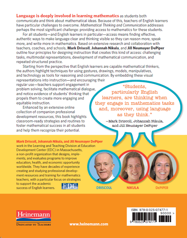 “Mathematical Thinking and Communication is based on over a decade of research and development focused on meeting the needs of middle school English Learners in mathematics. Driscoll, Nikula, and DePiper present engaging examples to illustrate how teachers can put research-based recommendations for teaching ELs in mathematics into practice. As a mathematics educator who studies English Learners in mathematics classrooms, I was most impressed with how the authors distilled their extensive work into practical, yet flexible, strategies and techniques that others can use. I look forward to using this resource in my teaching and professional development with middle school mathematics teachers.”
