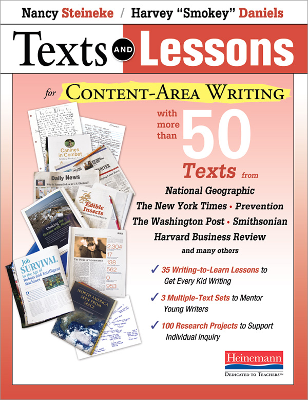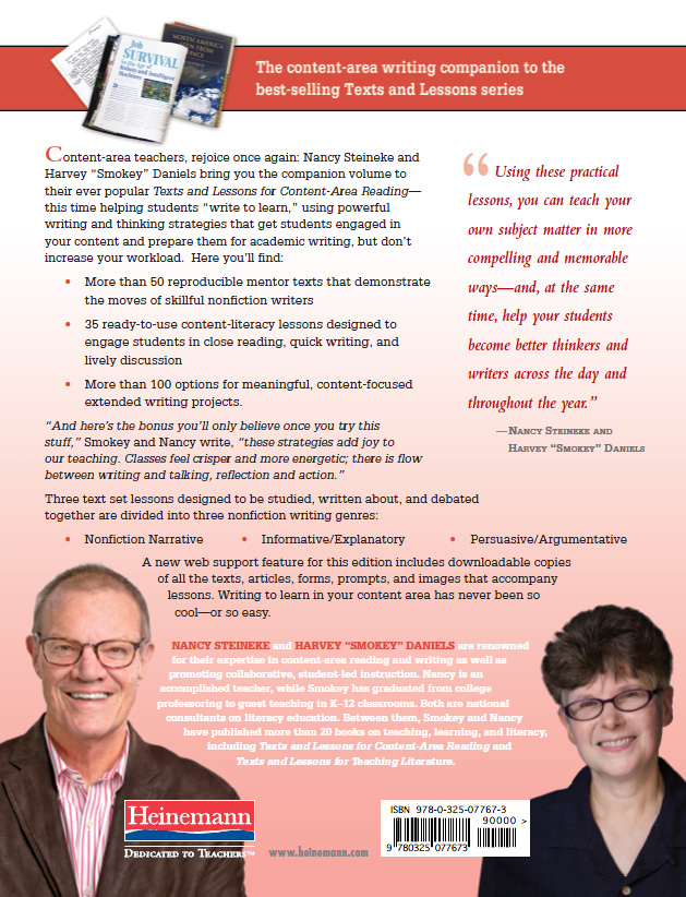 Content-area teachers, rejoice once again:  Harvey “Smokey” Daniels and Nancy Steineke bring you the companion volume to their ever popular Texts & Lessons for Content-Area Reading—this time helping students “write to learn,” using powerful writing and thinking strategies that get students engaged in your content and prepare them for academic writing, but don’t increase your workload.