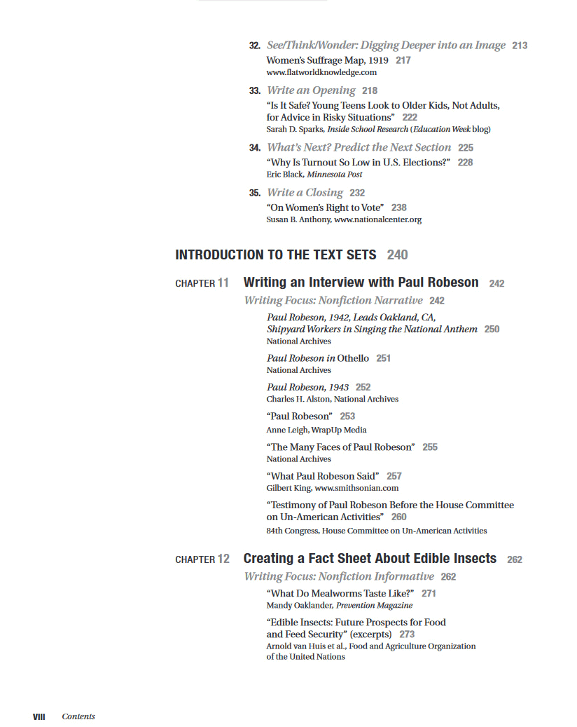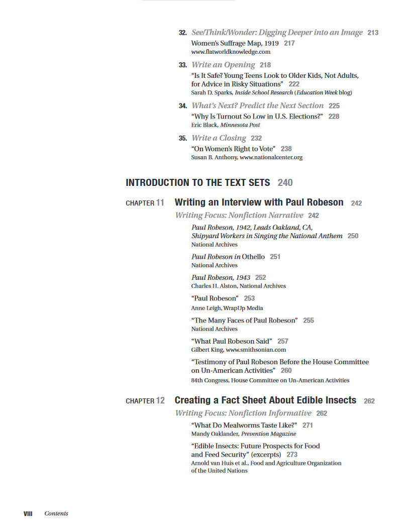 Three text set lessons designed to be studied, written about, and debated together are divided into three nonfiction writing genres: