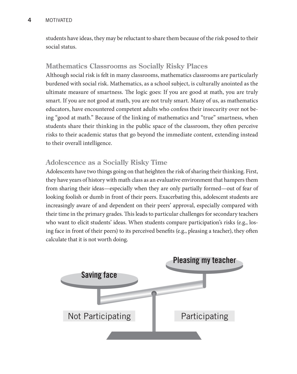 Participating in math class feels socially risky to students. Staying silent often feels safer. Motivated shows why certain teaching strategies create classroom climates where students want to join in. This book explores the key factors of motivational math classrooms along with strategies for weaving each one into your instruction.