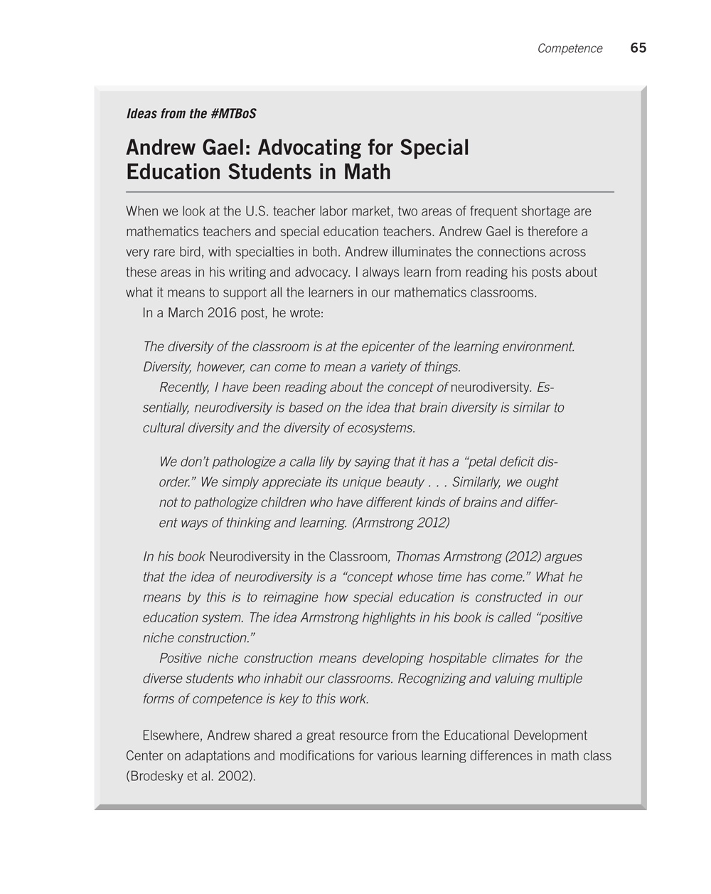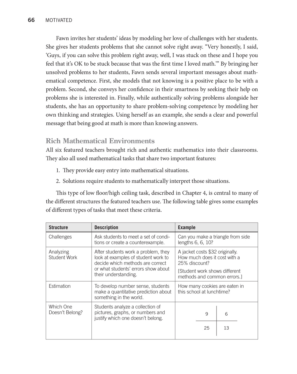 These features of motivational math classrooms are explored in-depth. You’ll find suggestions for identifying what impedes each factor, along with strategies for weaving them into your instruction. You’ll also be introduced to an online community who support each other’s efforts to teach this way.