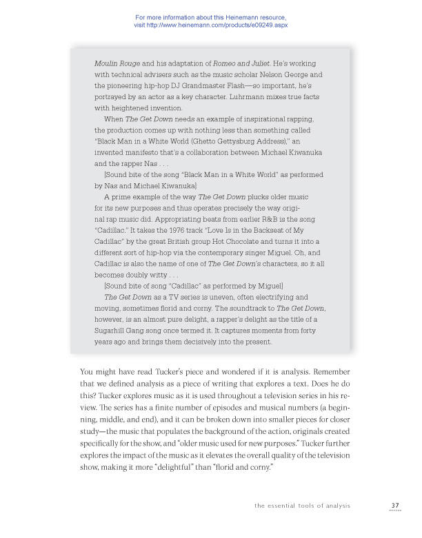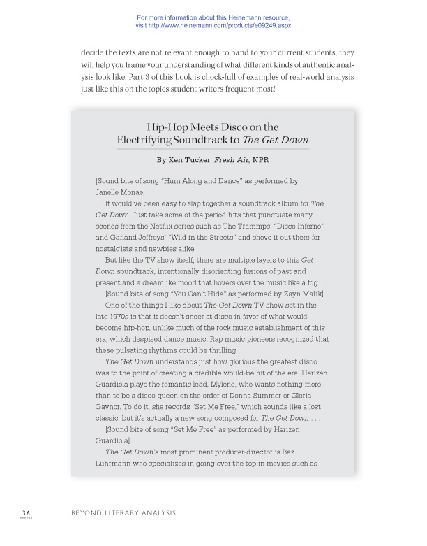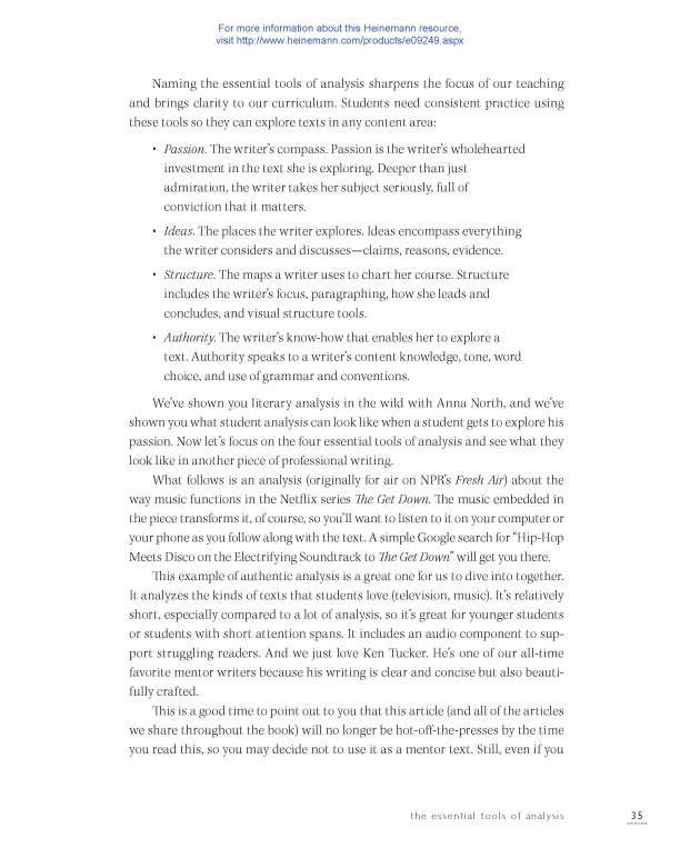 “Are you ready for a mind-bending journey into analytical writing? This book holds a new vision for student engagement grounded in current, authentic, and relevant texts. I guarantee it will upend your understanding of analysis. Full of sentence and passage studies that ignite student voice, mini-lessons that clarify the intent of organizational structures, and a deep understanding of how best to learn from a mentor text, this book will make you a better writing teacher. It’s simply brilliant.”—Penny Kittle, author of Book Love and coauthor of 180 Days