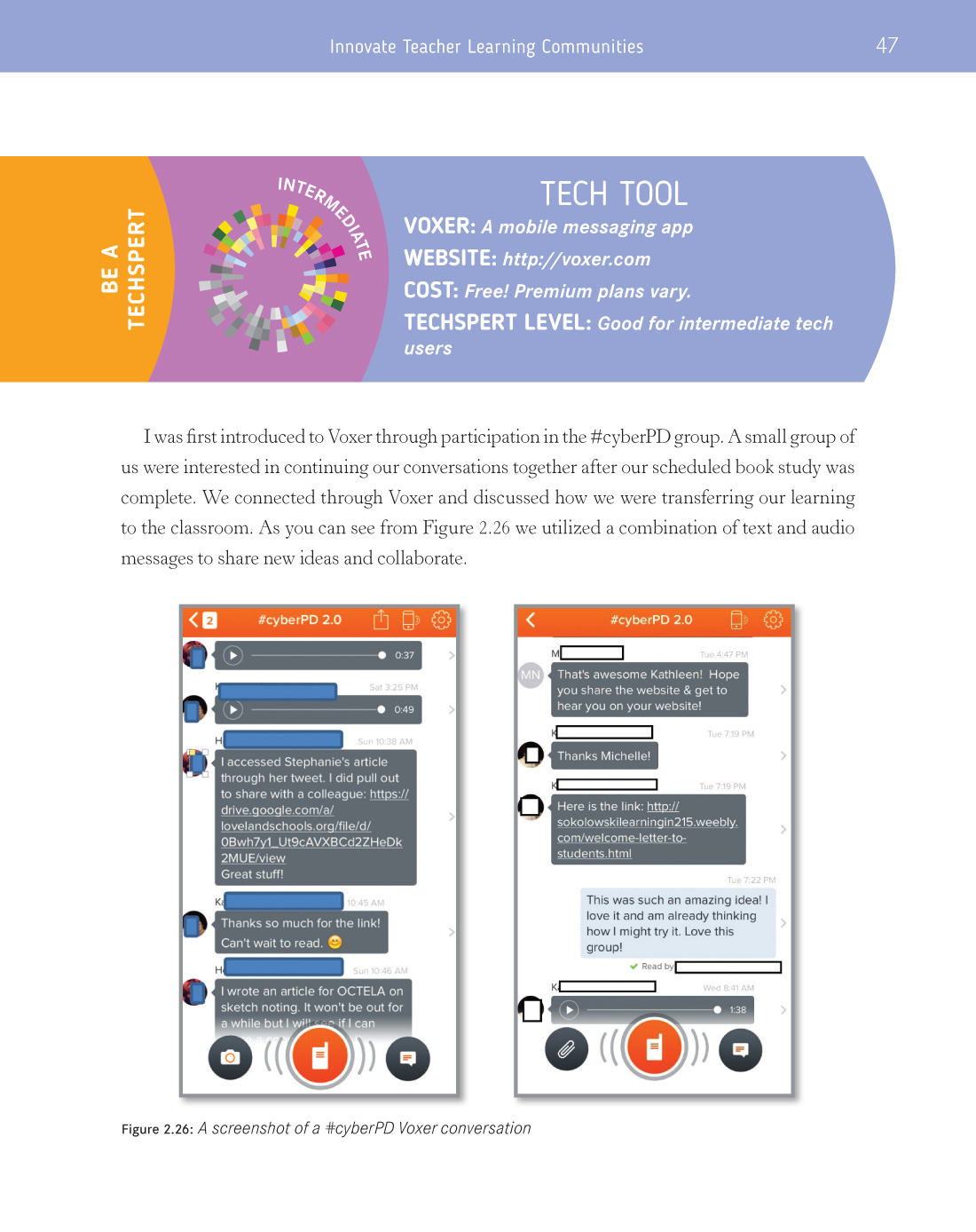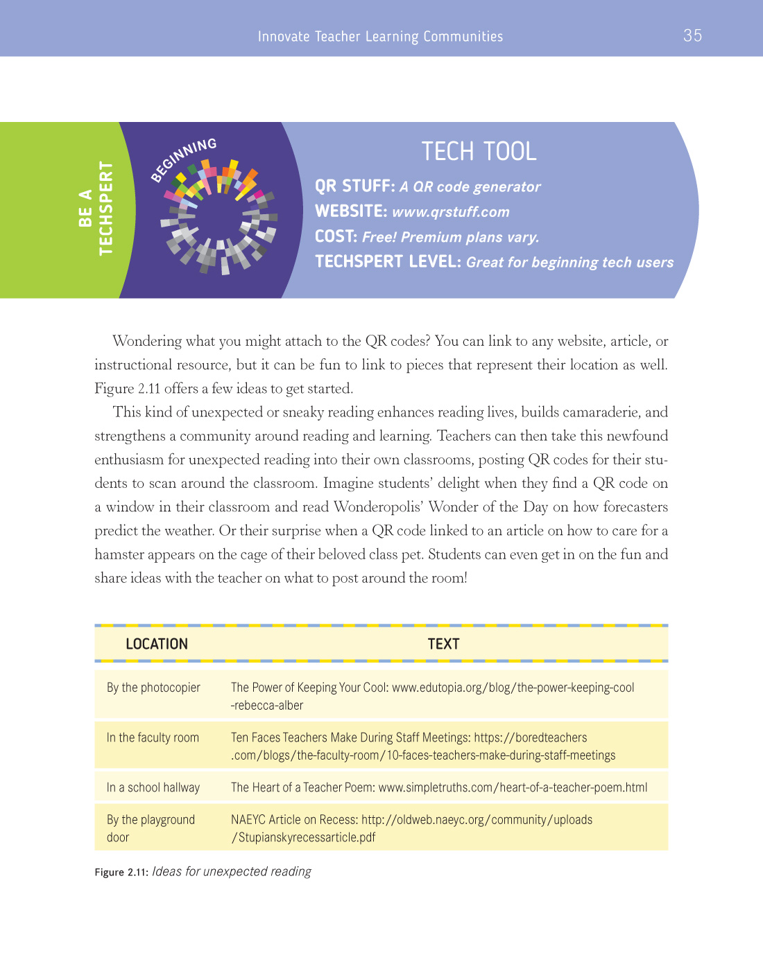 In Chapter 2, I share how you might use technology to transform the learning community within your school. You will learn how to cultivate teachers’ reading lives, create spaces for teacher learning, and cultivate your personal learning network, alongside your teachers. In Chapter 3, I tackle professional development and offer numerous suggestions on how to use technology to differentiate your sessions, better engage teachers in their own learning, and curate useful instructional resources. You will learn about “flipped coaching” and imagine the possibilities for your own work.