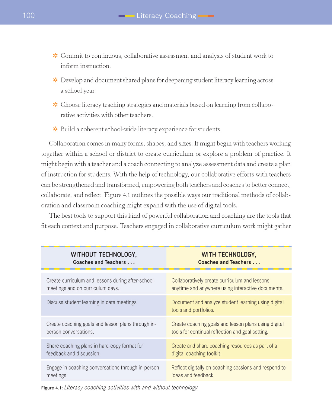 This first chapter introduces you to literacy coaching with digital tools and provided a framework for using technology to support teacher learning. In the remaining chapters, we explore the varied ways you can use technology to support teacher learning based on the common roles we take on as literacy coaches: building teacher learning communities, creating professional development experiences, and engaging in intentional classroom coaching.