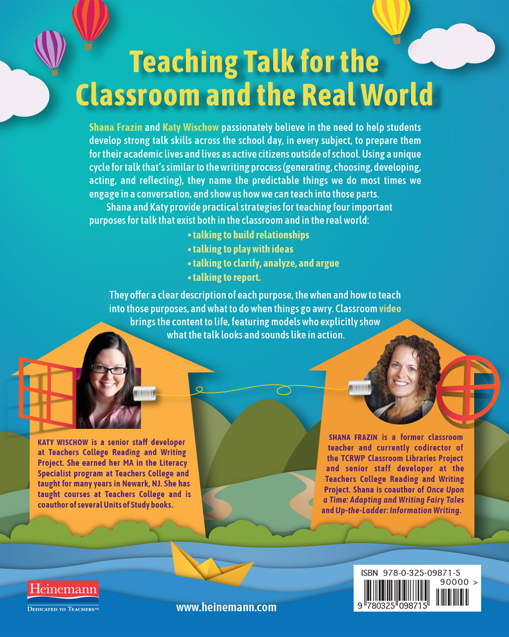 Shana Frazin and Katy Wischow passionately believe in the need to help students develop strong talk skills across the school day, in every subject, to prepare them for their academic lives and lives as active citizens outside of school. Using a unique “cycle” for talk that’s similar to the writing process (generating, choosing, developing, acting, and reflecting), they name the predictable things we do most times we engage in a conversation, and show us how we can teach into those parts.