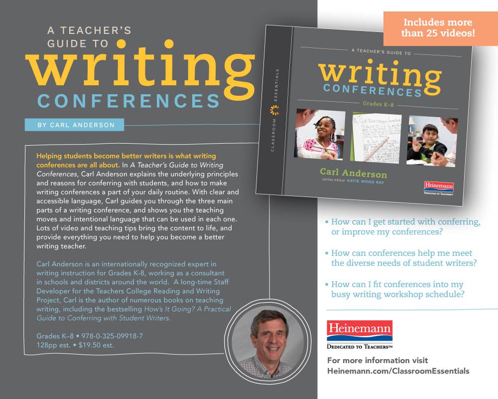 Helping students become better writers is what writing conferences are all about.In A Teacher’s Guide to Writing Conferences, Carl Anderson explains the underlying principles and reasons for conferring with students, and how to make writing conferences a part of your daily routine. With clear and accessible language, Carl guides you through the three main parts of a writing conference, and shows you the teaching moves and intentional language that can be used in each one.  He helps you understand: