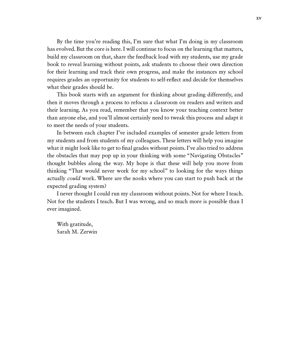 'Sarah addresses every grading obstacle one could think of. She provides ways to navigate objections that parents, athletic directors, administrators, colleagues, colleges, and even students might have with this innovative way of reporting grades.