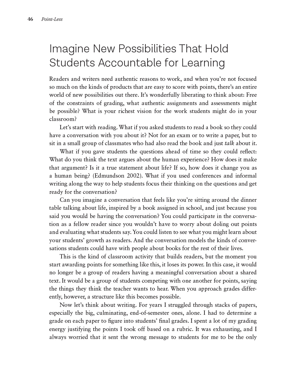 'It’s exciting to think how instruction could change if teachers weren’t compelled to evaluate everything students did for the mere purpose of putting points in the grade book. Are you ready to find your path to a better way of grading? Are you ready to lead students on this journey to becoming better readers, writers, and thinkers? If so, you are going to love Point-Less!”--Cris Tovani