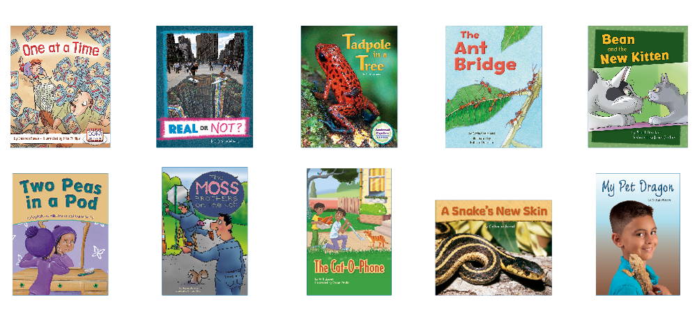 • 10 original titles (6 copies of each title) at text level J on the F&P Text Level Gradient™: One at a Time; Real or Not?; Tadpole in a Tree; The Ant Bridge; Bean and the New Kitten; Two Peas in a Pod; The Moss Brothers on the Job; The Cat-O-Phone; A Snake's New Skin; My Pet Dragon