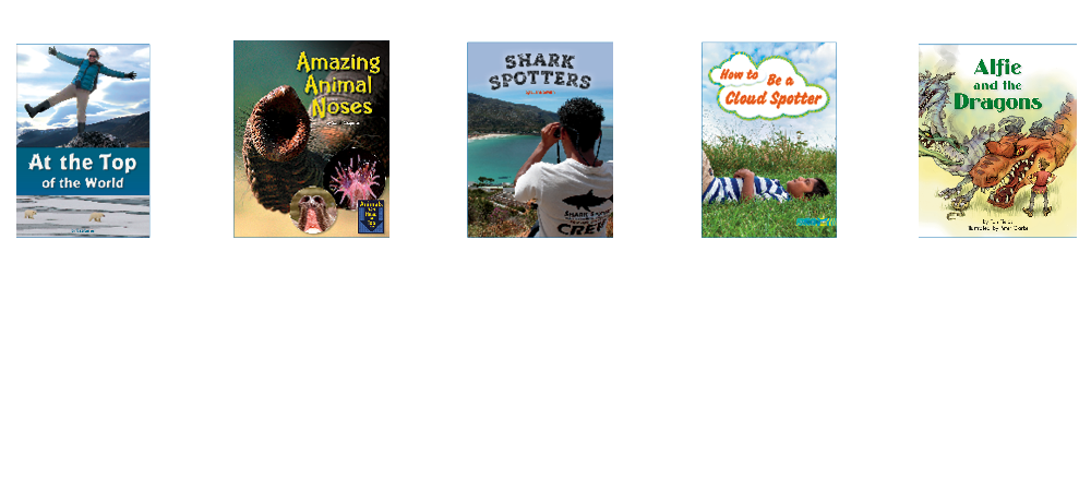 • 5 original titles (6 copies of each title) at text level O on the F&P Text Level Gradient™: At the Top of the World; Amazing Animal Noses; Shark Spotters; How to Be a Cloud Spotter; Alfie and the Dragons