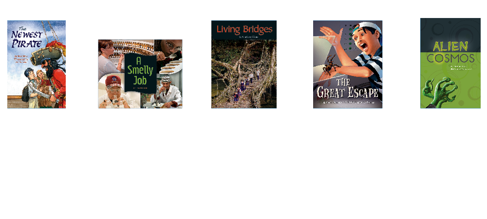 • 5 original titles (6 copies of each title) at text level P on the F&P Text Level Gradient™: The Newest Pirate; A Smelly Job; Living Bridges; The Great Escape; Alien Cosmos