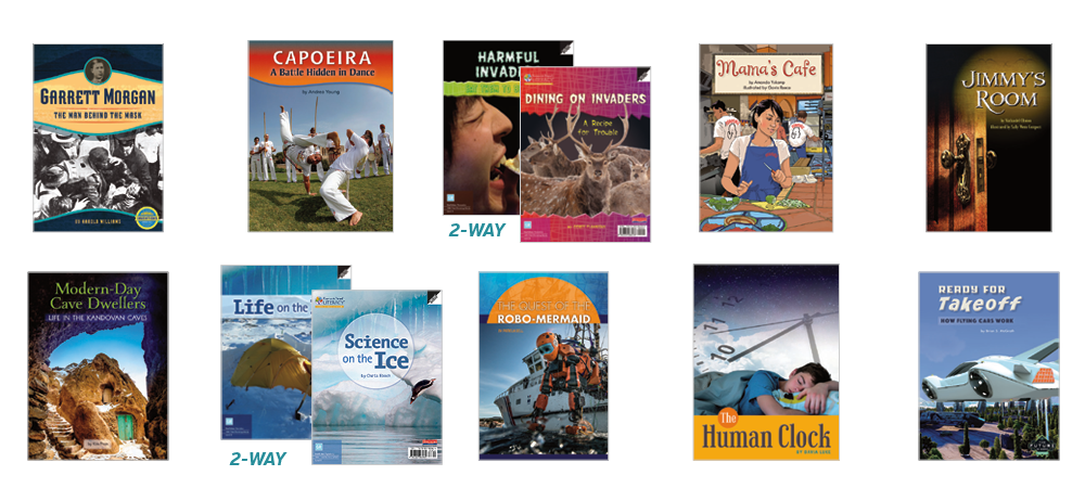• 10 original titles (6 copies of each title) at text level X on the F&P Text Level Gradient™: Garrett Morgan: The Man Behind the Mask; Capoeira: A Battle Hidden in Dance; Harmful Invaders: Eat Them to Beat Them / Dining on Invaders: A Recipe for Trouble (two-way book); Mama's Cafe; Jimmy's Room; Modern-Day Cave Dwellers: Life in the Kandovan Caves; Life on the Ice / Science on the Ice (two-way book); The Quest of the Robo-Mermaid; The Human Clock; Ready for Takeoff: How Flying Cars Work