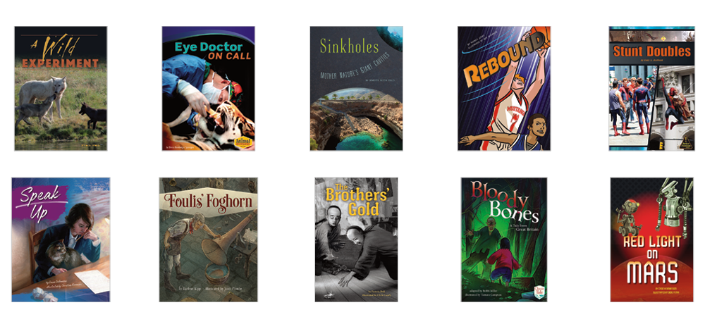 • 10 original titles (6 copies of each title) at text level T on the F&P Text Level Gradient™: A Wild Experiment; Eye Doctor on Call; Sinkholes: Mother Nature’s Giant Cavities; Rebound; Stunt Doubles; Speak Up; Foulis' Foghorn; The Brothers' Gold; Bloody Bones: A Tale from Great Britain; Red Light on Mars