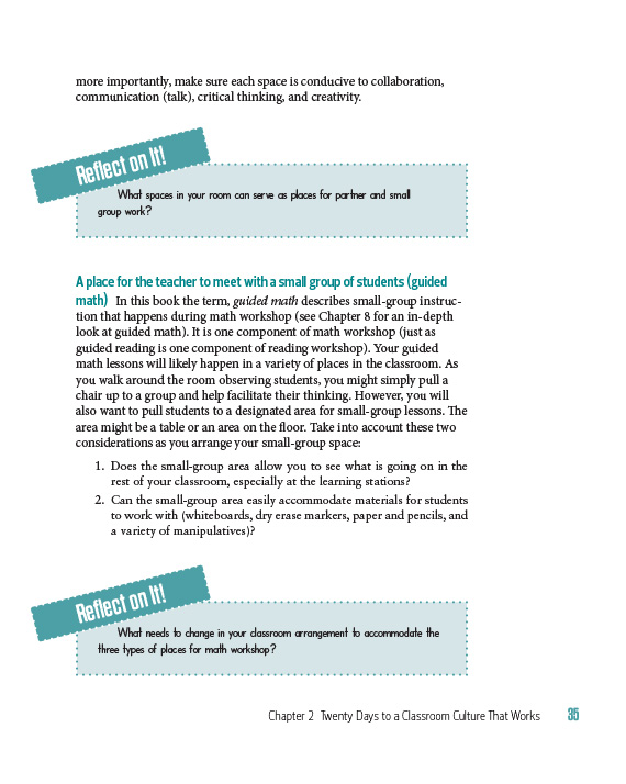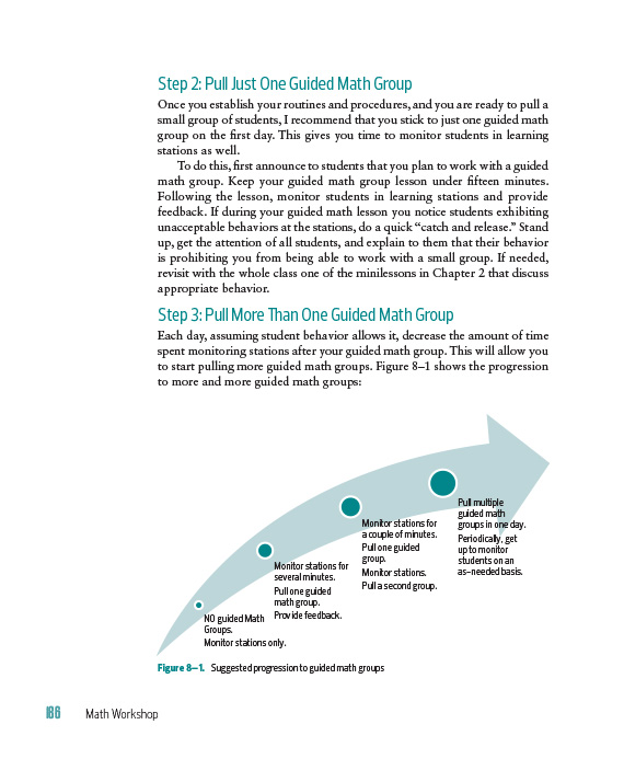 The resource then offers “Twenty Days to a Classroom Culture That Works,” which includes 20 minilessons that support the communication and practice of expectations surrounding the workshop model. From there, it explores three classroom-tested math workshop structures, providing practical ideas for routines, focus lessons, guided math groups, learning stations, and reflections so you can get started with math workshop in your classroom today.