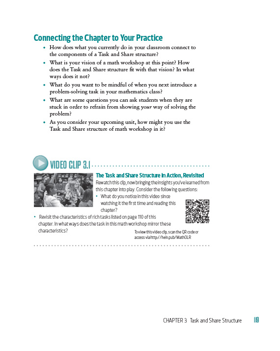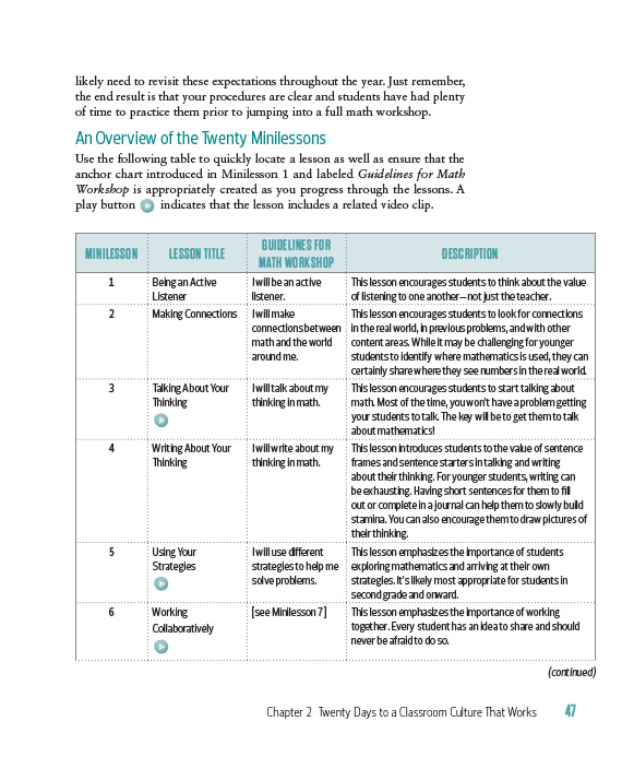 The streaming video clips invite you inside K–5 classrooms for a seeing-is-believing look at math workshop in action. Seeing clips of actual teachers and students engaged in math workshop is the next best thing to observing the model in a classroom.